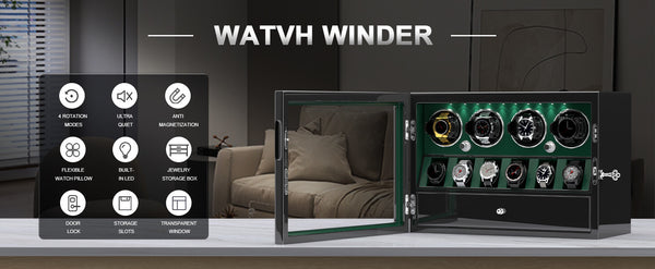 - Material : Der automatische Uhrenbeweger von XTELARY für 4 Uhren besteht aus handgefertigtem Holz mit einem Fenster aus organischem Acrylglas, einer stilvollen Außenseite in Klavierlackoptik und einer Innenseite aus veganem Leder.